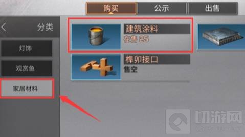 2、购买。在交易市场中靠近店铺,点击交易进入。在交易的页面中找到家具选项点击进入后找到家具材料。如果有玩家在出售就可以买到建筑涂料了。