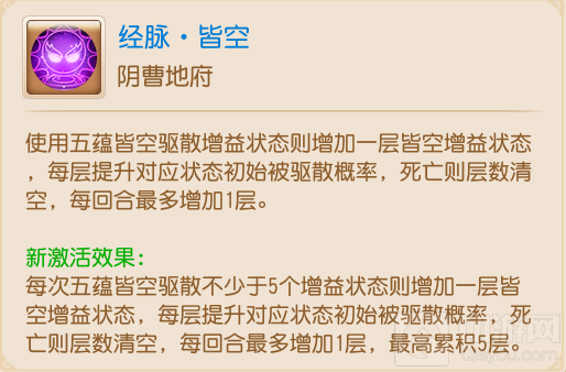 作为驱散流派地府的核心经脉,此前只需驱散增益状态就可增加层数的皆空经脉在叠加层数上可以说是相当轻松。而一旦叠加至满层,五蕴皆空驱散一出往往可以让对手数个单位费尽心思叠加的状态瞬间清空。但在本次调整之后,至少驱散5个增益状态才能增加层数的皆空经脉显然在叠加层数的难度上提升了不少,以后想要稳定驱散还需一番苦功。