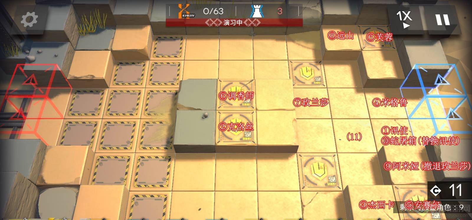 ③、在右下角高台防御符文的左侧部署狙击干员杰西卡,向上攻击。