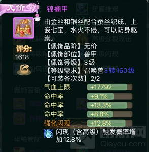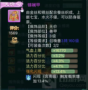 3、气血站桩型召唤兽(白泽、龙女等)兽甲:固定属性条气血上限,兽甲是召唤兽佩饰三件套中唯一可以出气血百分比的位置,所以这个位置气血百分比是一定不能少的,不管任务还是PK。