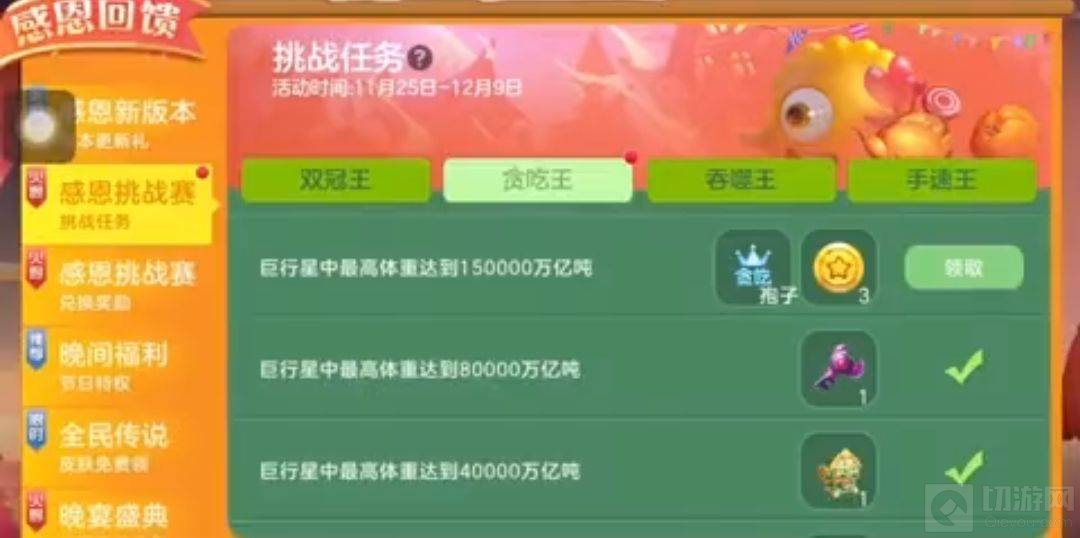 1、球球大作战贪吃王活动时间是11月25日~12月9日,完成贪吃王需要在巨行星模式中体重达到相应的体重即可。