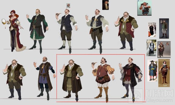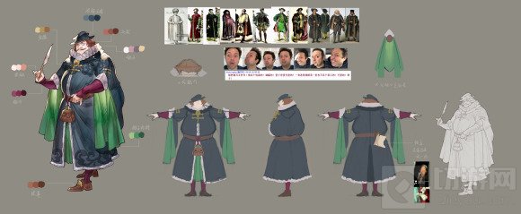 首先是欧洲的商人,中世纪的欧洲流行一种叫做拉夫领的领子,最初只流行于皇室,流传至民间后,很多有权势有钱的人也纷纷戴上这种领子。虽然很不舒服,但这在当时的欧洲是地位以及财富的象征。如果我们希望冒险者通过拉夫领来判断这是一个来自欧洲的富豪,同时又能辨别其职业特征,就会在设计的时候加入腰包,账本等细节,来帮助冒险者们更精准的定位人物。