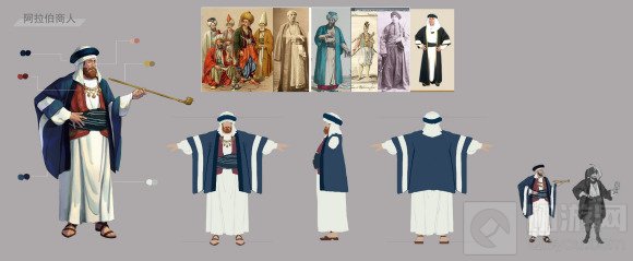 有别于欧洲商人,我们在阿拉伯的商人的设计上,除了为他设计了阿拉伯特有的宽敞服饰以及包裹白色的头巾之外,还在鞋子的设计上进行了更多的考虑。比如说,我们在设计阿拉伯的码头官员,酒馆老板甚至是男性居民的时候,都采用了具有他们传统特色的尖头鞋设计,而对于男性商人,我们的考虑是,虽然阿拉伯商人也会乘船航行,但是在大航海时代之前,他们经常需要进行陆上贸易,时常走动。长年累月下来,这些商人可能依然习惯性得穿凉鞋经商。