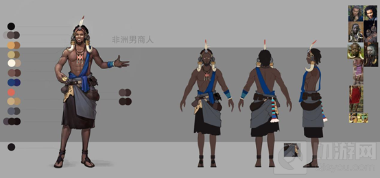 在设计非洲商人时,除了肤色,我们希望通过一些细节的地方凸显他的职业。比如兽皮制成的腰包,以及隐约漏出来一角的豹皮裙。这些可能在现代人看来比较具有土著气息,但在当时的非洲,这就是象征身份的一种装饰。