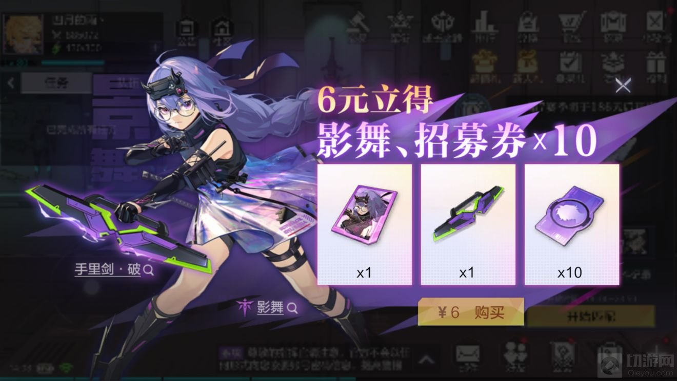 影舞在6元新手礼包中可以直接获得,最关键的是这个礼包不仅送了影舞的紫品武器,还额外送了10张猎人招募券。万一你能再抽到一个影舞或者一些其他的碎片,还能继续进阶。
