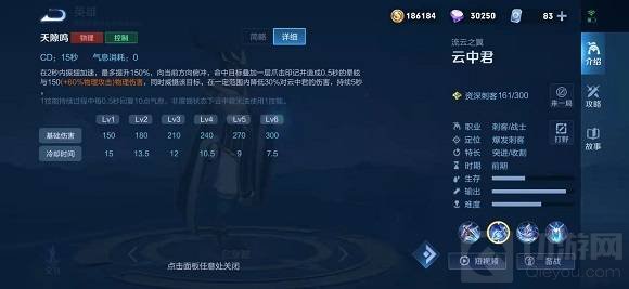 云中君在技能加点上主1副2,有大点大。云中君的被动技能是无视峡谷墙体障碍,并且攻击目标后有持续流血伤害。1突、2解、3免,除了身板脆以外其它技能效果都很完美。