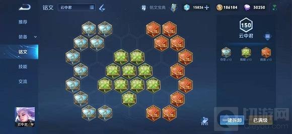 云中君铭文搭配10夺萃、10鹰眼、10祸源。夺萃保证前期续航,10鹰眼提高前期伤害,10祸源提高前期暴击率。