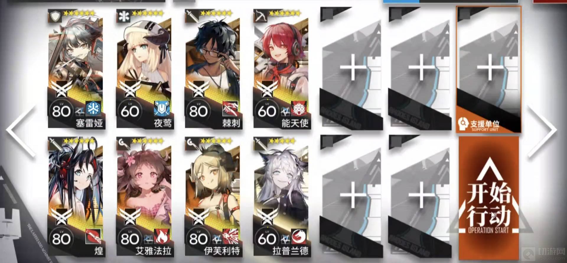 1、干员选择塞雷娅,煌,夜莺,艾雅法拉,棘刺,伊芙丽特,能天使,拉普兰德。