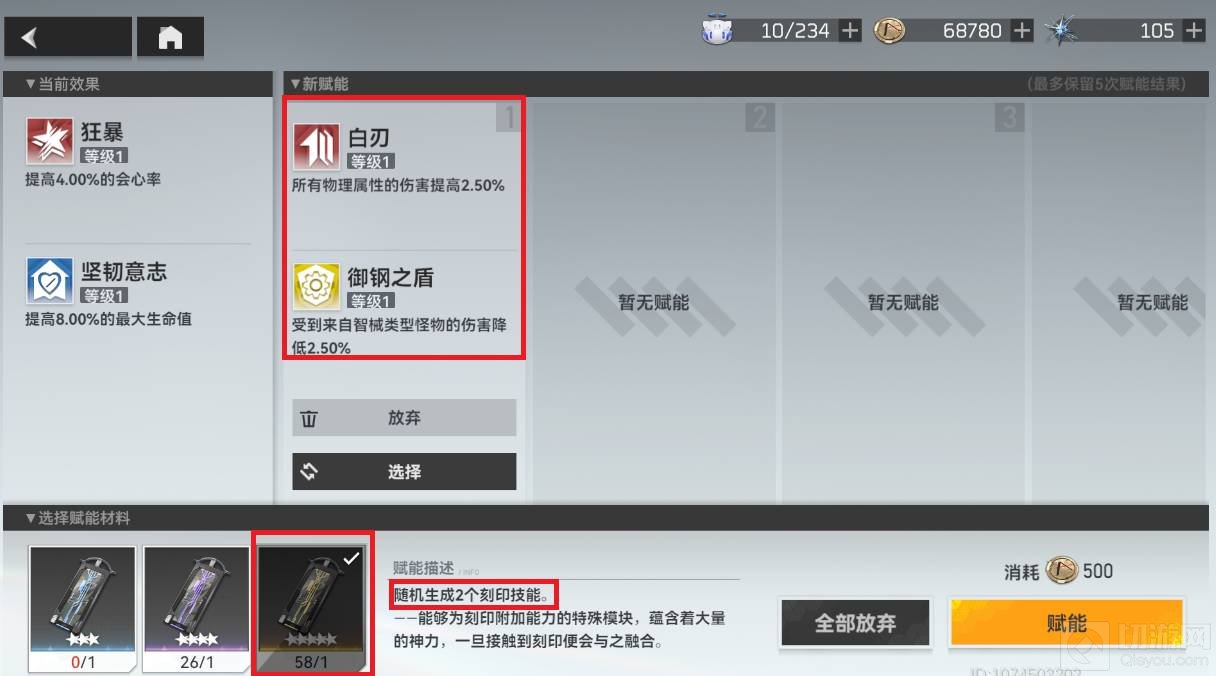 4、最后使用高级赋能模块,刷新出两个刻印技能。
