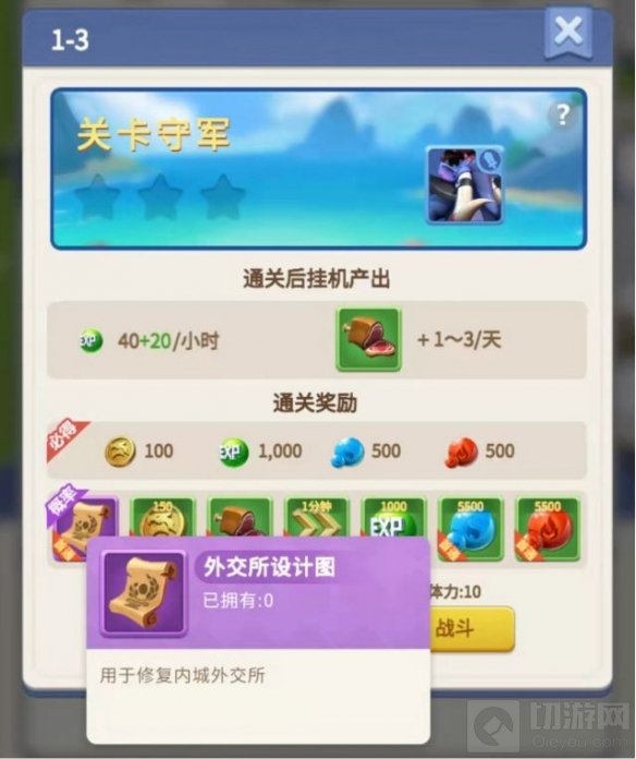 同时前往冒险通关1-3即可获得外交所设计图,即可修复外交所,加入联盟后,就可以利用外交所缩减建筑时间。