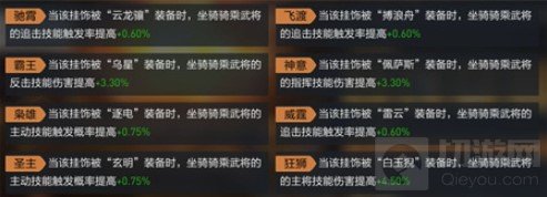 挂饰的锻造过程中可随机产生不同坐骑的专属增益,当镶嵌于对应的坐骑装备时,可为乘骑武将带来技能触发率、伤害数值或全队防御力等专属效果。通过专家打造,有概率获得挂件的专属特性。