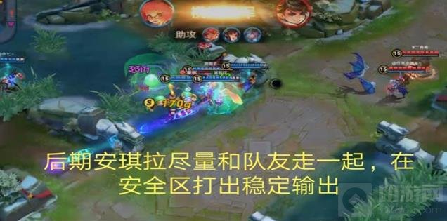 后期一般是打大团战,安琪拉应该跟在队友身边,不要离队友太远,防止被抓时队友来不及支援就被秒了。团战时要慎重使用二技能,这个技能是安琪拉的保命技能,当敌人来切时候使用二技能眩晕再配合队友给他致命一击!