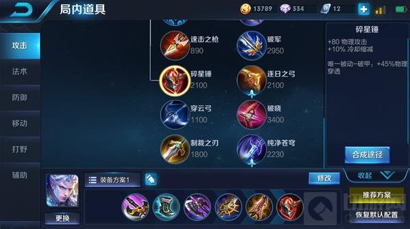 狩猎宽刃升级后的巡守利斧进一步提高铠对野怪造成的伤害,获得的寒冰惩击还能帮助铠留人,提高Gank成功率。暗影战斧是战士最实用的装备之一,物理攻击、物理穿透、冷却缩减等属性的加成让铠的杀伤力更足,被动还有机会减速敌军。宗师之力和无尽战刃可以大幅提高铠的暴击率和物理攻击,并额外提高暴击伤害,是铠强杀对方C位的核心两件套,且铠通常都是二技能进场,刚好可以触发宗师之力的被动,提高不少伤害。碎星锤具有较高的百分比物理穿透和物理攻击加成,让铠在面对敌方坦克时依旧能打出超高的伤害。