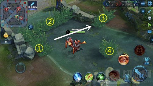 如果打野选择红开,那么辅助开局就来占领①草丛的视野(蓝开的话就占对面河道的视野)