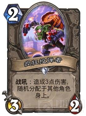 疯狂投弹者的身材跟精灵龙身材一样,都是2费3/2,但是唯一不同就是技能,随机对其他角色身上造成3点伤害,这就得看脸了,脸好的可以把对面1-2血的随从清掉,脸黑的话玩自己冲。