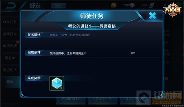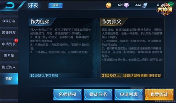 拜师:游戏中20级以下的玩家可以拜21级、倔强青铜III段位以上的人为师,并且可以拥有和师父一起开黑的经验和金币加成,完成任务和出师后还有额外的奖励奉送;