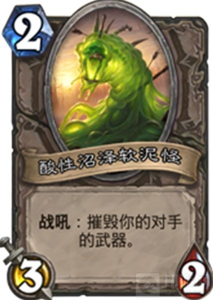 即使没有特效,2费3/2也是很不错的属性。而且,沼泽酸性软泥怪很可能在打出的同时就干掉对手的一张牌。虽然对于某些英雄来说这就是一张白怪,但即便如此,它的价值依旧很高。当它发挥特效的时候,立刻移除对手的武器是很多对手的噩梦。摧毁武器比摧毁随从更给力,毕竟2/3的武器能造成的伤害比2/3的随从更多。