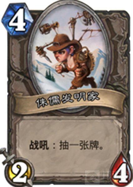 侏儒发明家的属性并不高,但是抽一张牌确实所有玩家都希望看到的效果。侏儒发明家可以给你带来手牌的优势。属性不高可能会让你场上处于劣势,但是它的特效可以让你在游戏后期表现得更好。而且即便属性只有2/4,2点攻击一般也能干掉一只场上的随从。在第四个回合,它拥有干掉前期随从的潜力,而如果是在后期,蓝多的时候有很大几率抽上的那一张牌可以立刻给你带来帮助。