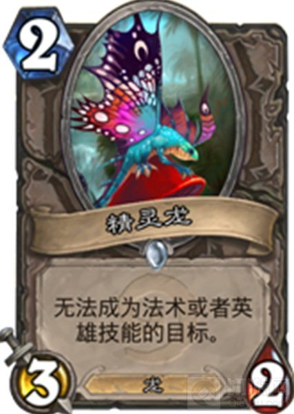 我们已经说了多次,2费3/2的属性是很不错的,精灵龙的特效和其他随从相比有很大不同,它不会给其他随从带来增益,相反,它的特效是防御性质的。单体移除类法术无法伤害到它,它通常都可以活到你的下个回合。这样的特效在游戏前期双方都努力抢占场上控制时是极为实用的。