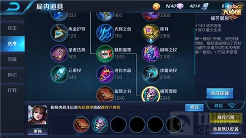 不用多想,先出血族之书,理由有三。第一,它便宜,只需要1240金币;第二,它增加20%法术吸血能力,保证貂蝉的持续对线;第三,它提供的10%冷却缩减,在大招开启情况下的貂蝉,能多次使用1、2技能配合被动打出巨幅伤害。另外的核心装备痛苦面具,更多是配合被动来触发折磨效果,而且中后期开始就需要法术穿透的支持,才能保证伤害可以打的购足。虽然回响之杖也是貂蝉的核心装,不过因为单人solo地图就没有必备选出,因为这件装备更适合打团。