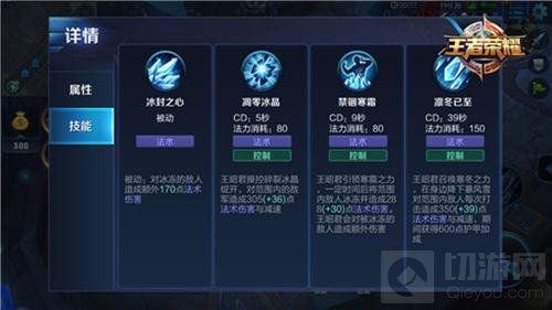 技能分析:(被动)冰封之心为王昭君提供了更多的输出伤害来源,王昭君用普攻攻击冰冻状态下的敌人伤害还是很客观的一技能凋零冰晶是瞬发技能,CD短,并且能够减速范围内的敌人,可以利用此技能提高禁锢寒霜的命中率,二技能禁锢寒霜只要命中目标就能百分之百冰冻敌人,一旦敌人被控,触发被动后的普通攻击打在敌人身上会很痛的,而且此技能的冰冻时间很长,足够你打出两次以上的普通攻击。不足的是释放技能需要预判,技能打空的几率很高大招凛冬已至是王昭君核心技能,技能持续时间长,伤害高,范围广,群体减速,而且期间获得的高额护甲可以保证自身更久的存活时间。需要注意的是这个技能可以被打断,因此最好是敌人被控制之后再释放,效果会更佳。