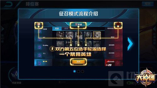 玩家开始征召模式后,将进入禁用阶段,由红蓝双方的5楼来负责禁用英雄的任务,各有一次禁用名额。每人有20秒的时间进行操作,需要注意的是如果没有选中英雄并点击“禁用”按钮的话,超时后默认不禁用英雄。