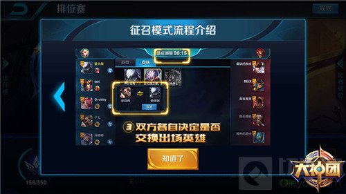 所有玩家选择完英雄后,同方可以进行英雄交换,前提是双方都拥有彼此选定的英雄。在20秒倒计时结束后,比赛开始。互换英雄的玩家记得把铭文页和技能调整为合适的状态哦!